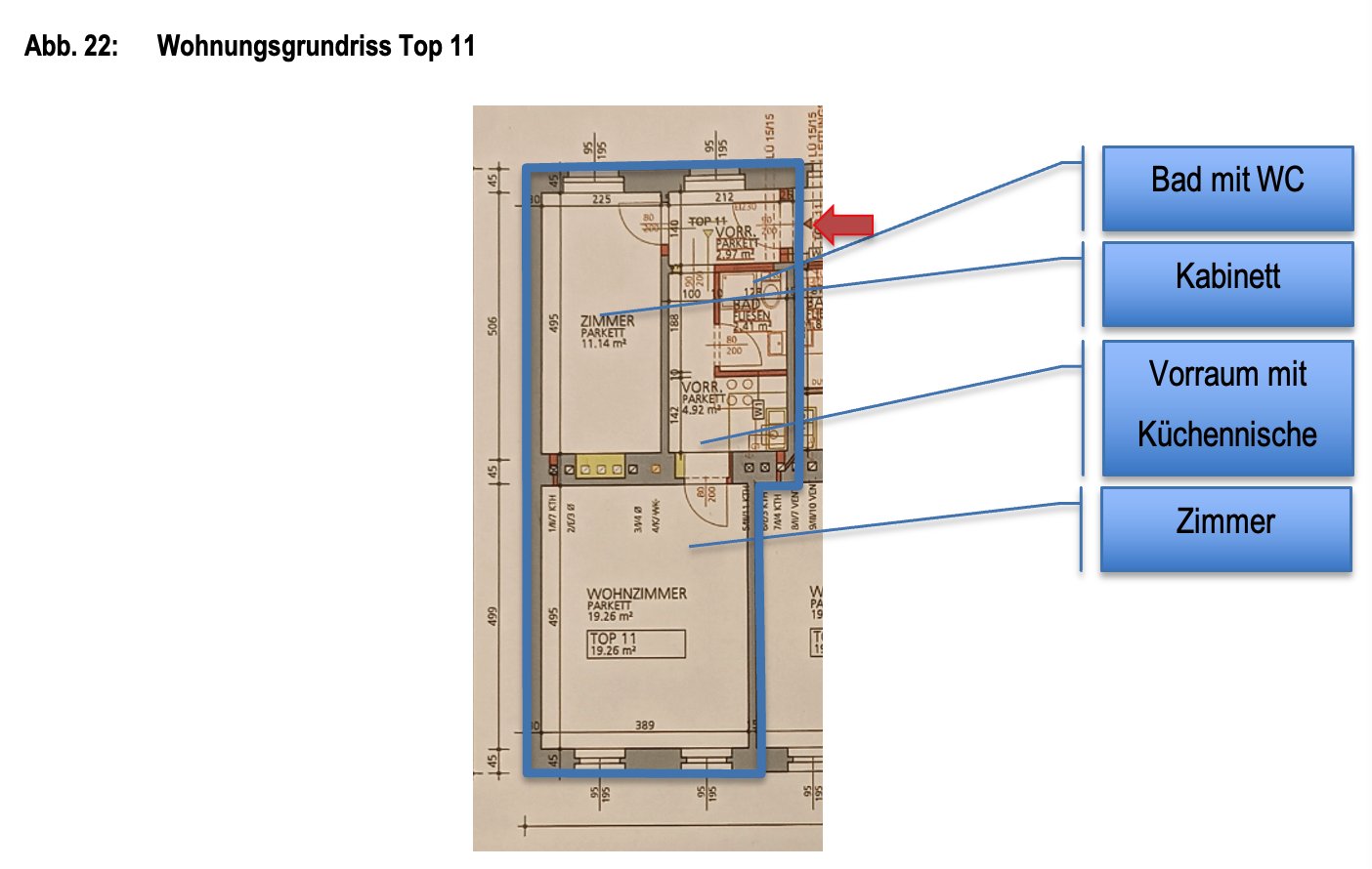 Die bewertungsgegenständliche Wohnung Top 11 ist im 3. Stock der Liegenschaft situiert und wird vom allgemeinen Gang über eine einflügelige Holztür betreten. Die Wohnung gliedert sich in einen Vorraum mit Küchennische, ein Bad mit WC, ein Kabinett und ein Zimmer. Sie ist sowohl straßen- als auch hofseitig ausgerichtet und verfügt über in diese Richtung orientierte Fenster, die als Kunststofffenster ausgeführt sind. Ein Querlüften ist aufgrund der Konfiguration der Wohnung möglich.