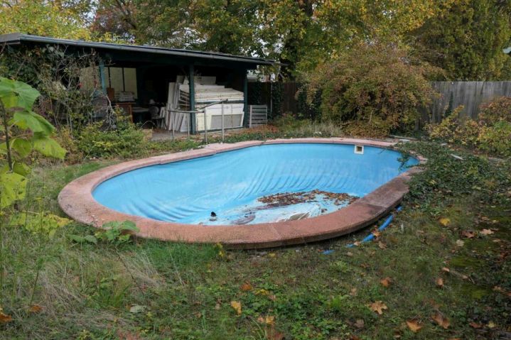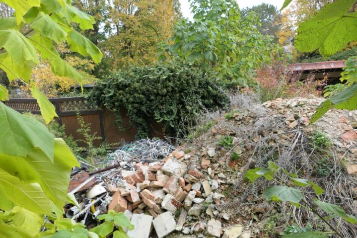 Der Garten ist begrünt und mit einzelnen Bäumen und Sträuchern bewachsen und weist einen gärtnerisch ungepflegten ("verwilderten") Zustand auf, in einigen Bereichen ist Bauschutt abgelagert. Im Garten befindet sich ein Swimmingpool (ovales Folienbecken), neben dem Pool ist eine alte Gartenhütte vorhanden.