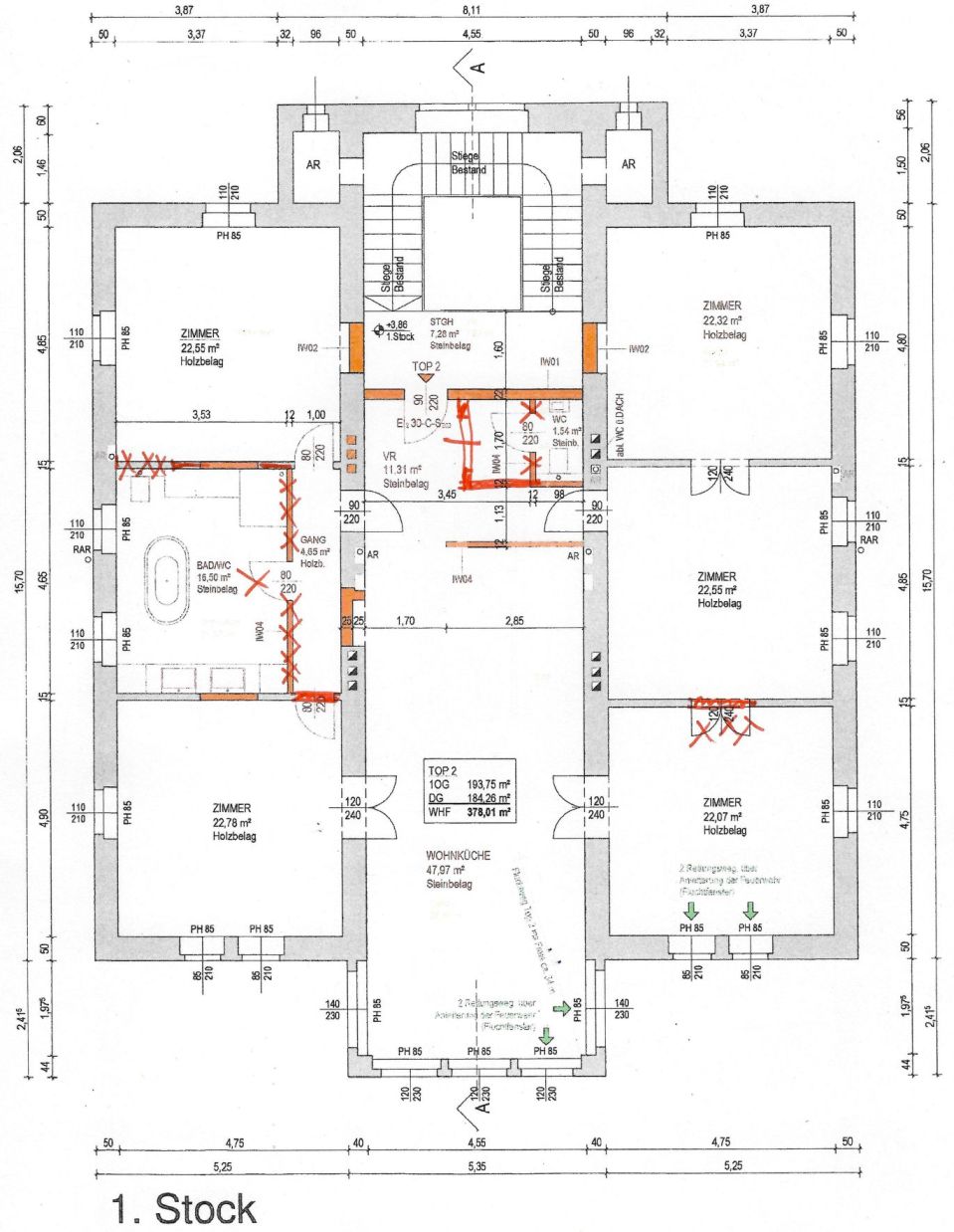 Gemäß den vorliegenden Plänen für die Generalsanierung und den Umbau sind vom Eigentümer zwei Wohneinheiten geplant (Top 1 im Erdgeschoss, Top 2 im Obergeschoss und Dachgeschoss).